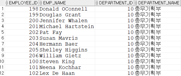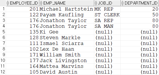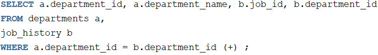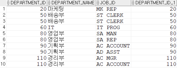 위 쿼리는 사원 테이블이 기준이 되어 job_history 테이블을 LEFT OUTER JOIN으로 연결했는데 테이블 순서를 바꾸면 RIGHT OUTER JOIN으로 변경이 가능하다.