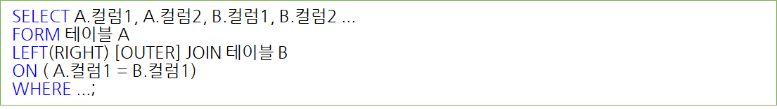 또한 외부 조인은 OUTER라는 키워드는 생략이 가능하다. LEFT JOIN 혹은 RIGHT JOIN이라고 명시해도 이는 외부 조인을 의미한다.