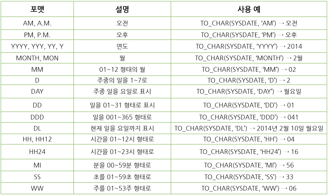 숫자나 날짜를 문자로 변환해 주는 함수가 바로 TO_CHAR로 매개변수로는 숫자나 날짜가 올 수 있고 반환 결과를 특정 형식에 맞게 출력할 수 있다.